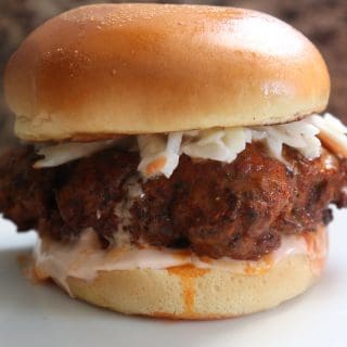 Prep your frying oil to 375°F. The temp will drop slightly once you put a piece of chicken in. The ideal frying temperature will be 350°F and we'll cook each piece for around 5-8 minutes depending on the size of the piece, making sure to flip the chicken a few times to ensure even cooking. Once the piece of chicken is cooked, move it into the buffalo sauce to coat, making sure to move it around enough so it doesn't soak up the sauce. Move the chicken to a sheet pan with a wire rack. Season with salt and pepper. Make sure the sheet pan is lined with aluminum foil underneath the rack for easy clean up. Allow the chicken to cool for just a couple of minutes, while you prep your toasted bun and other ingredients.
